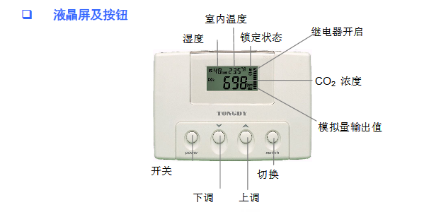 三、CO2監(jiān)測控制器F2000IAQ-CO2-30/50系列液晶屏及按鈕: