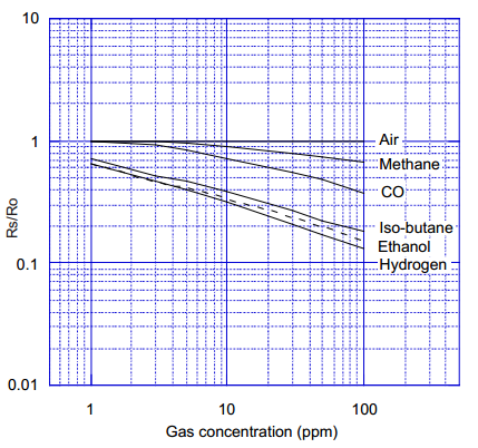 縱坐標(biāo)表示傳感器電阻比 Rs/Ro, Rs與Ro的定義如下: