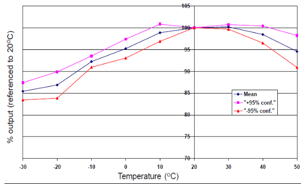 圖 1 顯示了溫度變化所引起的靈敏度變化。 數(shù)據(jù)取自典型批次傳感器。同時顯示 均值和 ± 95% 置信 區(qū)間。