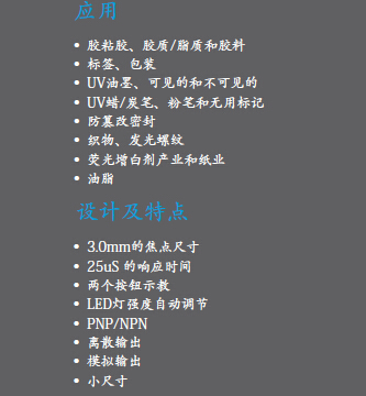 UVX傳感器的靈活性使其能在多種印刷應(yīng)用程序、包裝應(yīng)用程序和轉(zhuǎn)換應(yīng)用程序中的進(jìn)行簡(jiǎn)易設(shè)置。對(duì)于那些要求能對(duì)發(fā)光標(biāo)記或發(fā)光材料進(jìn)行檢測(cè)的應(yīng)用程序,UVX傳感器特別適用,并且UVX傳感器適用于多種此類應(yīng)用程序。