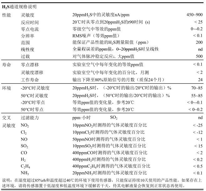 五、SOH-A2 型傳感器的H2S通道規(guī)格說明