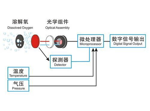 熒光法溶解氧傳感器是基于物理學中特定物質(zhì)對活性熒光的猝熄原理。來自一個發(fā)光二極管(LED)發(fā)出的藍光照射在熒光帽內(nèi)表面的熒光物質(zhì)上,內(nèi)表面的熒光物質(zhì)受到激發(fā),發(fā)出紅光,通過檢測紅光與藍光之間的相位差,并與內(nèi)部標定值比對,從而計算出氧分子的濃度,經(jīng)過溫度和氣壓自動補償輸出最終值。
