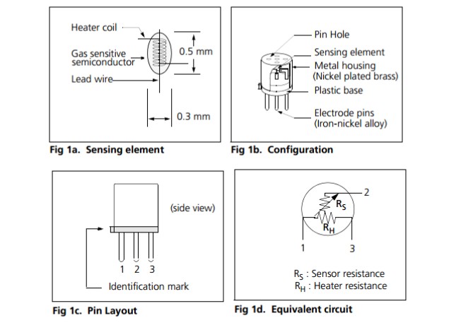 氣體感應(yīng)半導(dǎo)體材料是小珠子的類型,加熱線圈和電極線嵌入在元件中。敏感元件安裝在有5個(gè)可以通氣的小孔的金屬盒內(nèi)(Fig1) 。