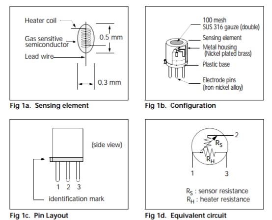 氣體感應(yīng)半導(dǎo)體材料是小珠子的類型,加熱線圈和電極線嵌入在元件中。敏感元件安裝在金屬封裝內(nèi),此封裝是用可以空氣流通的雙不銹鋼網(wǎng)眼制成。此網(wǎng)眼具有防爆特性(Fig1)。
