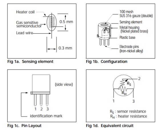 Fig2展示了此產(chǎn)品的標準使用電路。傳感器阻值(Rs)的變化導(dǎo)致了負載電阻(RL)上的電壓的變化。為了獲取最佳的性能和參數(shù),加熱電壓(VH),電路電壓(Vc)和負載電阻(RL)的值必須在給定的標準操作條件下的值,具體參數(shù)表在下一頁表述。