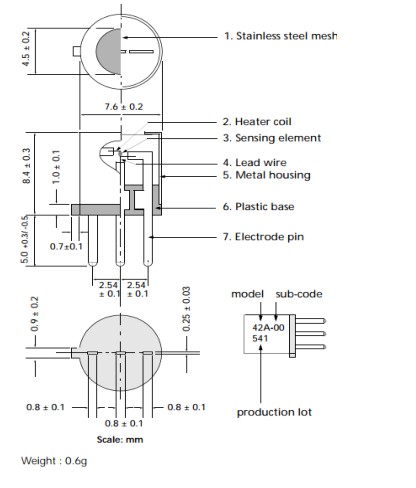 SB-42A是SnO2半導(dǎo)體氣體傳感器,對HCFS(如氟利昂R134a)有高靈敏度并且提高了抗其他氣體干擾的能力。此產(chǎn)品適合制冷劑氣體R134a,R-410a,R-407c的泄漏檢測。由于此產(chǎn)品的低功耗(120mW)特點,非常適合便攜式設(shè)備。 結(jié)構(gòu) 氣體感應(yīng)半導(dǎo)體材料是小珠子的類型,加熱線圈和電極線嵌入在元件中。敏感元件安裝在金屬封裝內(nèi),此封裝是用可以空氣流通的雙不銹鋼網(wǎng)眼制成。此網(wǎng)眼具有防爆特性(Fig1)。