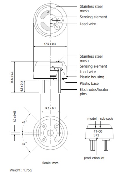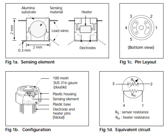 氣體感應(yīng)半導(dǎo)體材料是小珠子的類型,加熱線圈和電極線嵌入在元件中。敏感元件安裝在金屬封裝內(nèi),此封裝是用可以空氣流通的雙不銹鋼網(wǎng)眼制成。此網(wǎng)眼具有防爆特性(Fig1)。