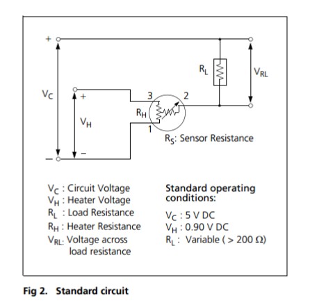 Fig2展示了此產(chǎn)品的標(biāo)準(zhǔn)使用電路。傳感器阻值(Rs)的變化導(dǎo)致了負(fù)載電阻(RL)上的電壓的變化。為了獲取最佳的性能和參數(shù),加熱電壓(VH),電路電壓(Vc)和負(fù)載電阻(RL)的值必須在給定的標(biāo)準(zhǔn)操作條件下的值,具體參數(shù)表在下一頁(yè)表述。
