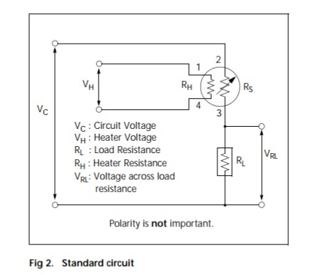 Fig2展示了此產(chǎn)品的標(biāo)準(zhǔn)使用電路。傳感器阻值(Rs)的變化導(dǎo)致了負(fù)載電阻(RL)上的電壓的變化。為了獲取最佳的性能和參數(shù),加熱電壓(VH),電路電壓(Vc)和負(fù)載電阻(RL)的值必須在給定的標(biāo)準(zhǔn)操作條件下的值,具體參數(shù)表在下一頁(yè)表述。