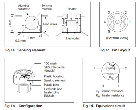 氣體感應(yīng)半導(dǎo)體材料緊貼在鋁基片上,金電極打印在基片上。氧化釕的薄加熱器打印在基片的背面,并且放在塑料封裝中(Fig1)。