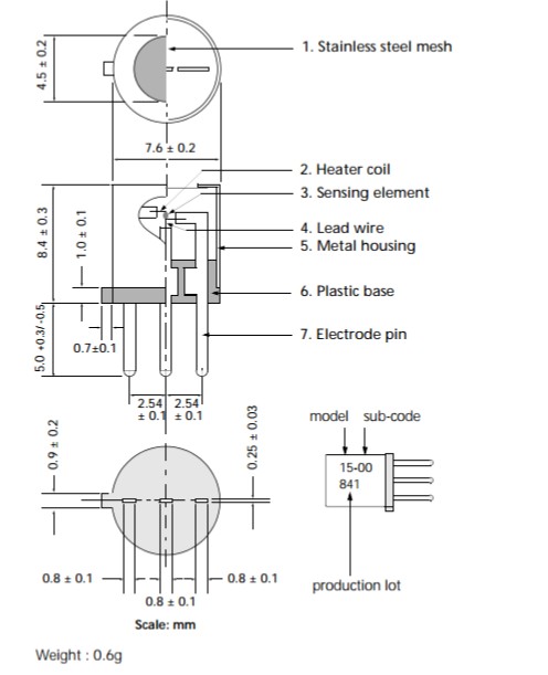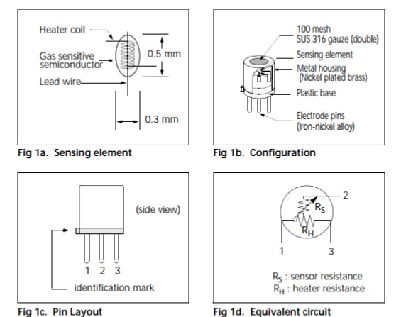氣敏半導(dǎo)體元件呈小珠形,內(nèi)嵌加熱線圈和電極線。傳感元件安裝在金屬外殼中,其中氣流通道內(nèi)有雙層不銹鋼網(wǎng)(100 mesh)。網(wǎng)格具備防爆特性。(Fig1)