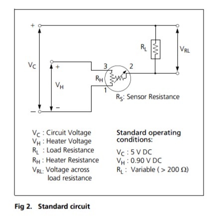 Fig2是該型號的標(biāo)準(zhǔn)工作電路圖。通過固定或可變電阻器(RL)上的輸出電壓的變化可獲取傳感器電阻?(RS)的變化。為發(fā)揮適宜性能并實現(xiàn)指定的特性,加熱器電壓(VH)、電路電壓(Vc)和負(fù)載電阻(RL)的值必須在標(biāo)準(zhǔn)工作條件規(guī)定的取值范圍內(nèi),規(guī)格參數(shù)表如下頁所示。