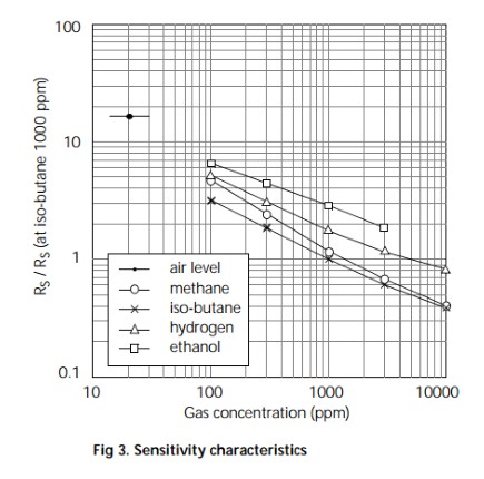 --傳感器阻值變化率:在含有1000ppm~3000ppm的異丁烷的空氣中