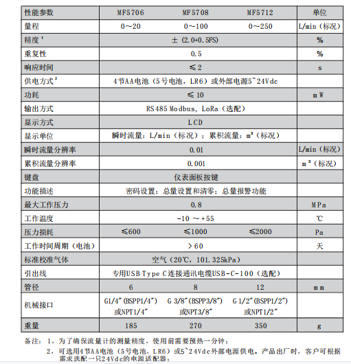 四:美國Siargo MF5700系列便攜式氣體質(zhì)量流量計(jì) 參數(shù):