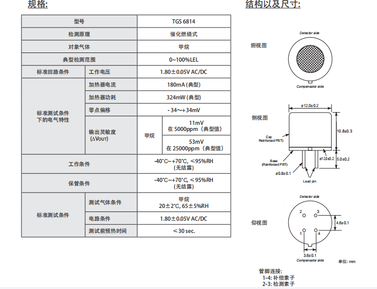 四、日本Figaro 甲烷傳感器 CH4傳感器 氣體傳感器 TGS6814 參數(shù):