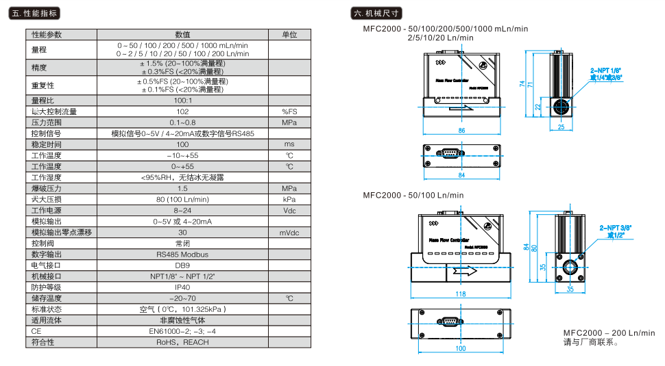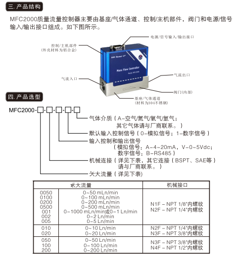 MFC2000質量流量控制器的控制范圍可達100:1,可工作在為0.1~0.8MPa,?-10~50C,機械接口NPT 1/8*~NPT1/2",并可定制其他機械接口。