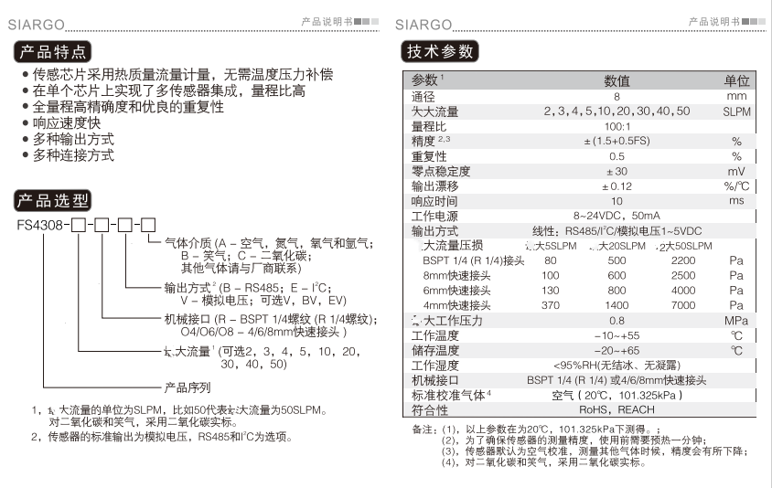 美國Siargo 氣體質(zhì)量流量傳感器 FS4300系列參數(shù):