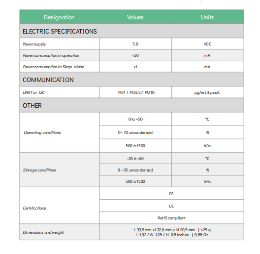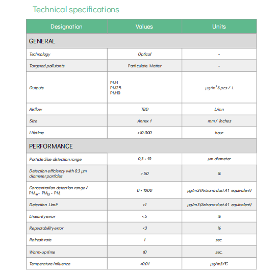 法國TERA 顆粒物傳感器 PM2.5傳感器 Next-PM-Lite 參數(shù):
