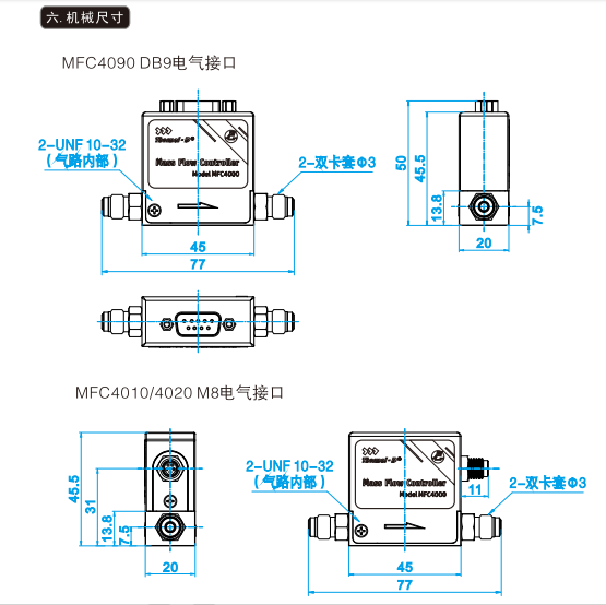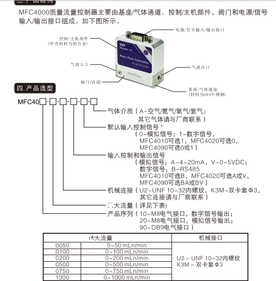MFC4000質量流量控制器的控制范圍可達100:1,可工作在為0. 1~0.8MPa,0~55C,機械接QUNF 10-32內螺紋或雙卡套中3,并可定制其他機械接口。