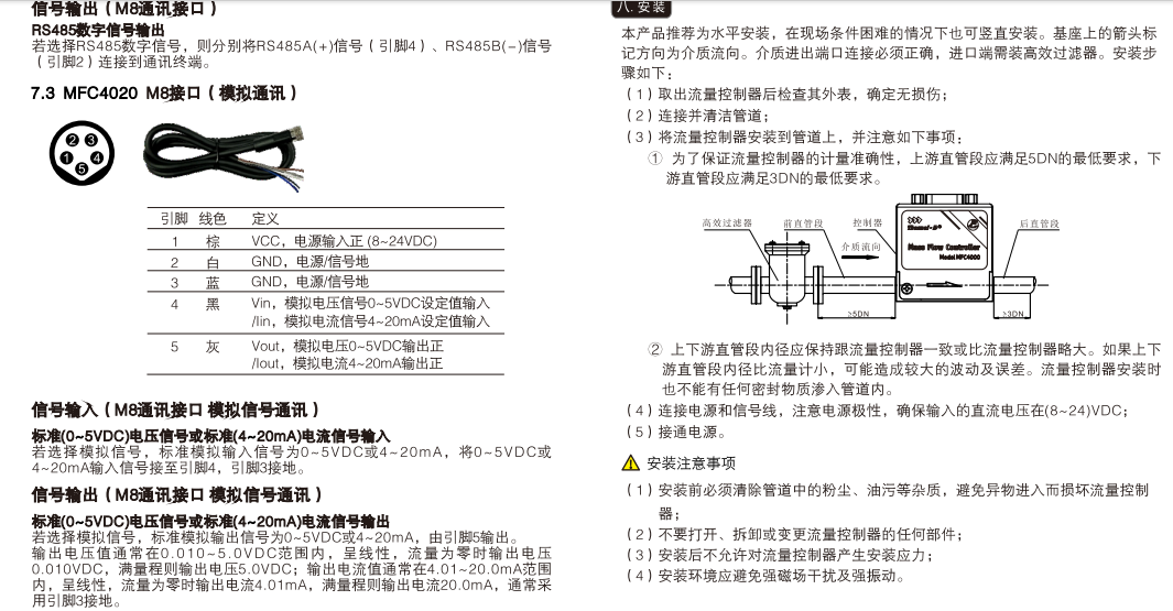 本產品說明書提供了MFC4000系列氣體質量流量控制器的基本信息,可用于非腐蝕性氣體流量控制,涵蓋質量流量50mL n/min~ 1000mLn/min,可提供0~ 5VDC或4~ 20mA模擬信號控制,或RS485Modbus數(shù)字信號控制。本產品說明書包含性能指標、機械尺寸、安裝及保修、客戶服務及訂貨等信息。