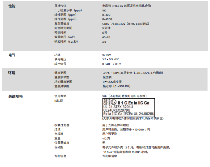 英國Alphasense VOC 光電離子傳感器 高級PID傳感器 – PIDX-A-04K 參數(shù):