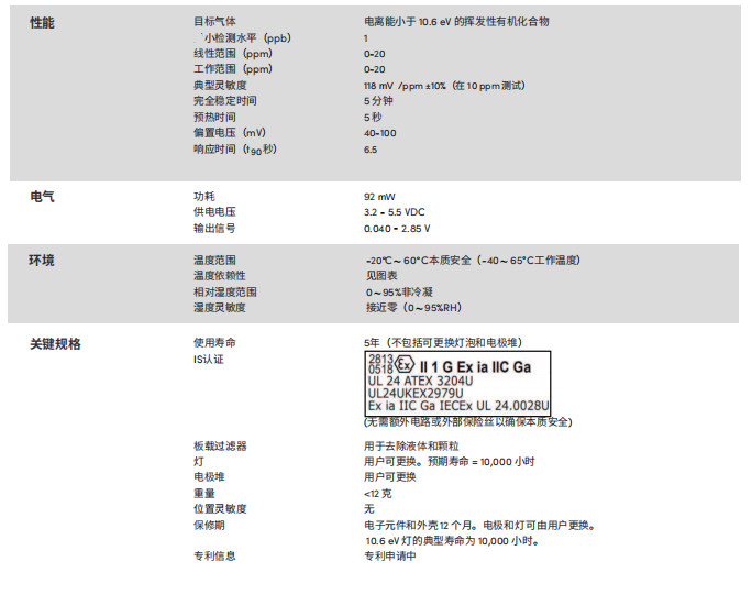 英國Alphasense VOC 光電離子傳感器 高級PID傳感器 – PIDX-A-020 參數(shù):