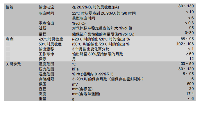 英國Alphasense O2 長壽命無鉛氧傳感器?LFO2-A1 參數(shù):