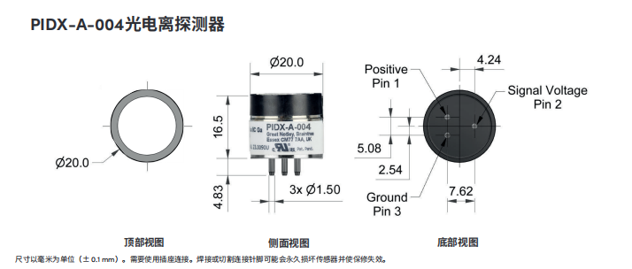 英國Alphasense VOC 光電離子傳感器 高級PID傳感器(0-4ppm)– PIDX-A-004尺寸: