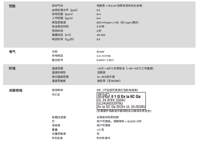 英國Alphasense VOC 光電離子傳感器 高級PID傳感器(0-4ppm)– PIDX-A-004 參數: