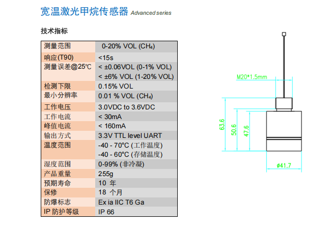 AG-6-CH4-2842-020甲烷傳感器采用自研激光器和光電探測(cè)器核心器件,結(jié)合穩(wěn)定的控溫算法、濃度反演算法和溫度補(bǔ)償算法實(shí)現(xiàn)甲烷濃度的精確測(cè)量;產(chǎn)品基于可調(diào)諧激光氣體吸收光譜技術(shù)(TD-LAS),內(nèi)部設(shè)計(jì)了多次反射光路結(jié)構(gòu),吸收光程長(zhǎng),探測(cè)靈敏度高 ; 標(biāo)準(zhǔn)螺紋安裝接口及不銹鋼結(jié)構(gòu)設(shè)計(jì)滿足防爆要求,方便客戶(hù)快速產(chǎn)品集成