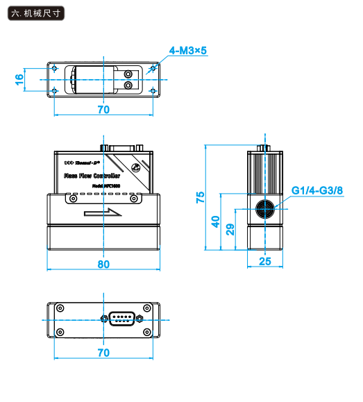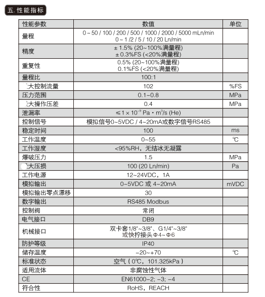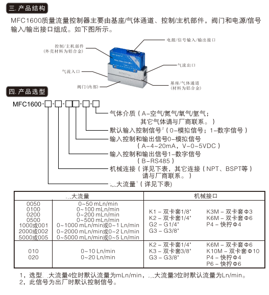 MFC1600質(zhì)量流量控制器的控制范圍可達(dá)100:1,可工作在0.1~0.8MPa,0~55℃,機(jī)械接口可選雙卡套、G螺紋或快擰接頭,并可定制其他機(jī)械接口。