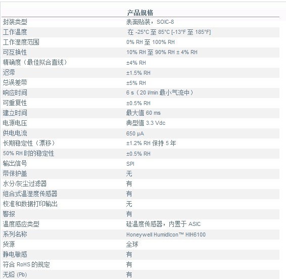 HIH6000系列數(shù)字式濕度/溫度傳感器:HIH6130/6131 系列是組合在同一個封裝內(nèi)的數(shù)字輸出式相對濕度 (RH) 和溫度傳感器。